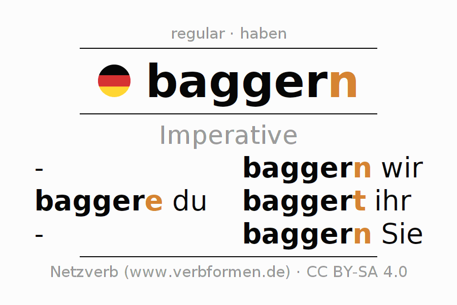 The conjugation of baggern (dig, excavate) in the imperative is: bagg(e)re (du), baggern wir, baggert (ihr), baggern Sie. The imperative is formed with the stem of present tense bagger. The endings -e, -n, -t, -n are appended to the stem. The endings in the 1st and 3rd person plural are shortened by e, since the verb ends with -ern. The personal pronoun is usually omitted in the 2nd person singular.The formation of the forms corresponds to the grammatical rules for the conjugation of the verbs in imperative. Comments ☆