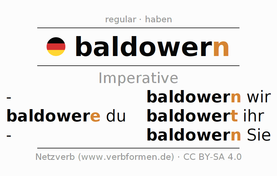 The conjugation of baldowern (check out, scout out) in the imperative is: baldow(e)re (du), baldowern wir, baldowert (ihr), baldowern Sie. The imperative is formed with the stem of present tense baldower. The endings -e, -n, -t, -n are appended to the stem. The endings in the 1st and 3rd person plural are shortened by e, since the verb ends with -ern. The personal pronoun is usually omitted in the 2nd person singular.The formation of the forms corresponds to the grammatical rules for the conjugation of the verbs in imperative. Comments ☆