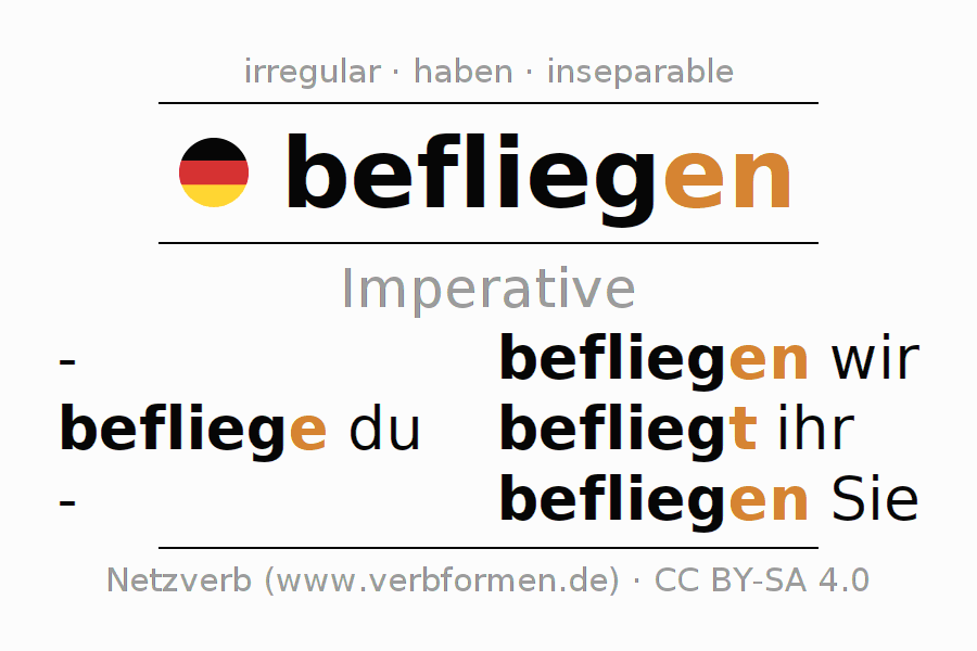 The verb befliegen fully conjugated in all persons and numbers in the Imperative Present