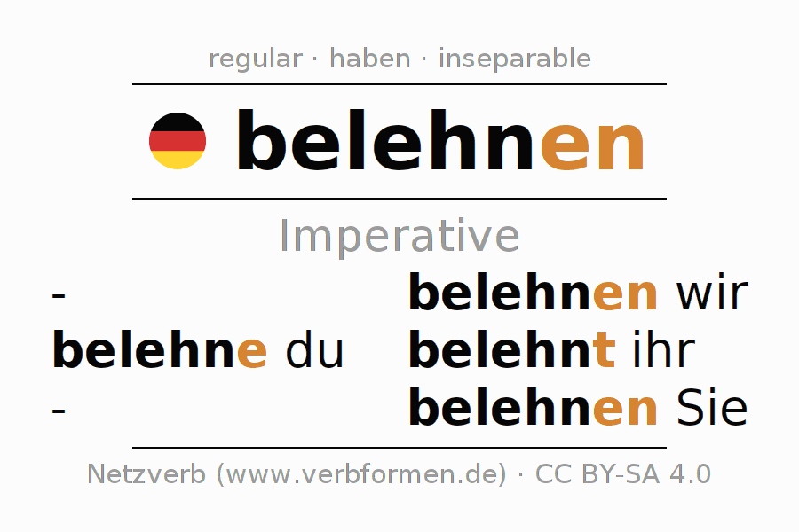 The conjugation of belehnen (enfeoff, feoff) in the imperative is: belehne (du), belehnen wir, belehnt (ihr), belehnen Sie. The imperative is formed with the stem of present tense lehn. The endings -e, -en, -t, -en are appended to the stem. The personal pronoun is usually omitted in the 2nd person singular.The formation of the forms corresponds to the grammatical rules for the conjugation of the verbs in imperative. Comments ☆