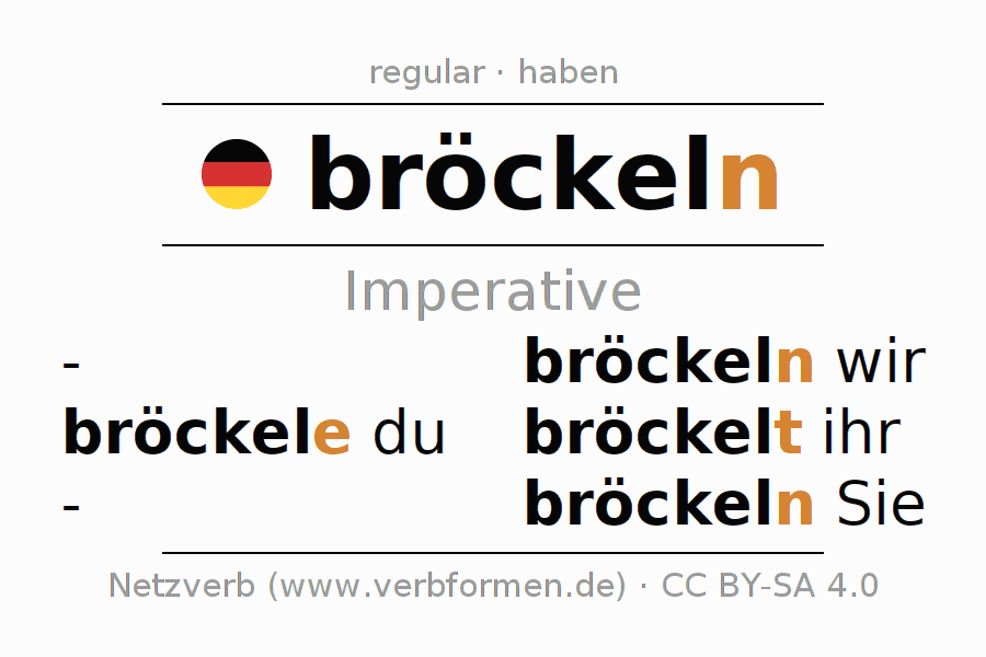 The conjugation of bröckeln (crumble, break apart) in the imperative is: bröck(e)le (du), bröckeln wir, bröckelt (ihr), bröckeln Sie. The imperative is formed with the stem of present tense bröckel. The endings -e, -n, -t, -n are appended to the stem. The endings in the 1st and 3rd person plural are shortened by e, since the verb ends with -ern. The personal pronoun is usually omitted in the 2nd person singular.The formation of the forms corresponds to the grammatical rules for the conjugation of the verbs in imperative. Comments ☆