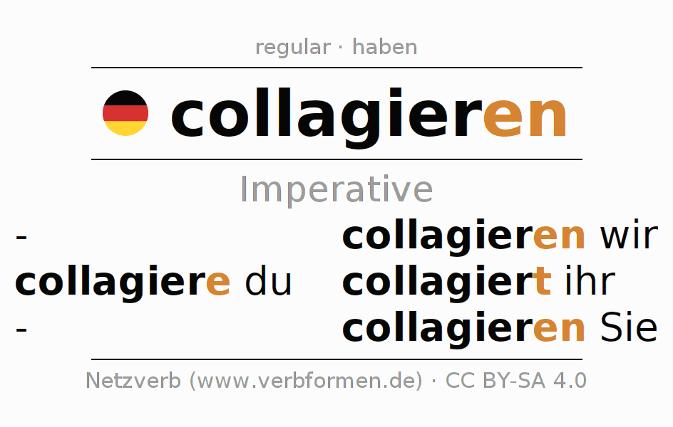 The conjugation of collagieren (collage, assemble) in the imperative is: collagiere (du), collagieren wir, collagiert (ihr), collagieren Sie. The imperative is formed with the stem of present tense collagier. The endings -e, -en, -t, -en are appended to the stem. The personal pronoun is usually omitted in the 2nd person singular.The formation of the forms corresponds to the grammatical rules for the conjugation of the verbs in imperative. Comments ☆
