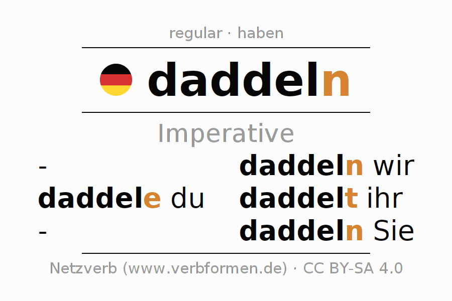 The verb daddeln fully conjugated in all persons and numbers in the Imperative Present