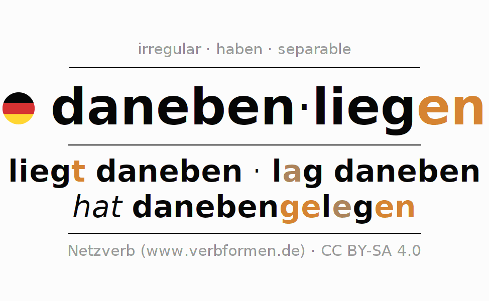 The conjugation of danebenliegen (be adjacent, be mistaken) in the imperative is: liege (du) daneben, liegen wir daneben, liegt (ihr) daneben, liegen Sie daneben. The imperative is formed with the stem of present tense lieg. The endings -e, -en, -t, -en are appended to the stem. The prefix daneben- of danebenliegen is separated.The personal pronoun is usually omitted in the 2nd person singular.The formation of the forms corresponds to the grammatical rules for the conjugation of the verbs in imperative. Comments ☆