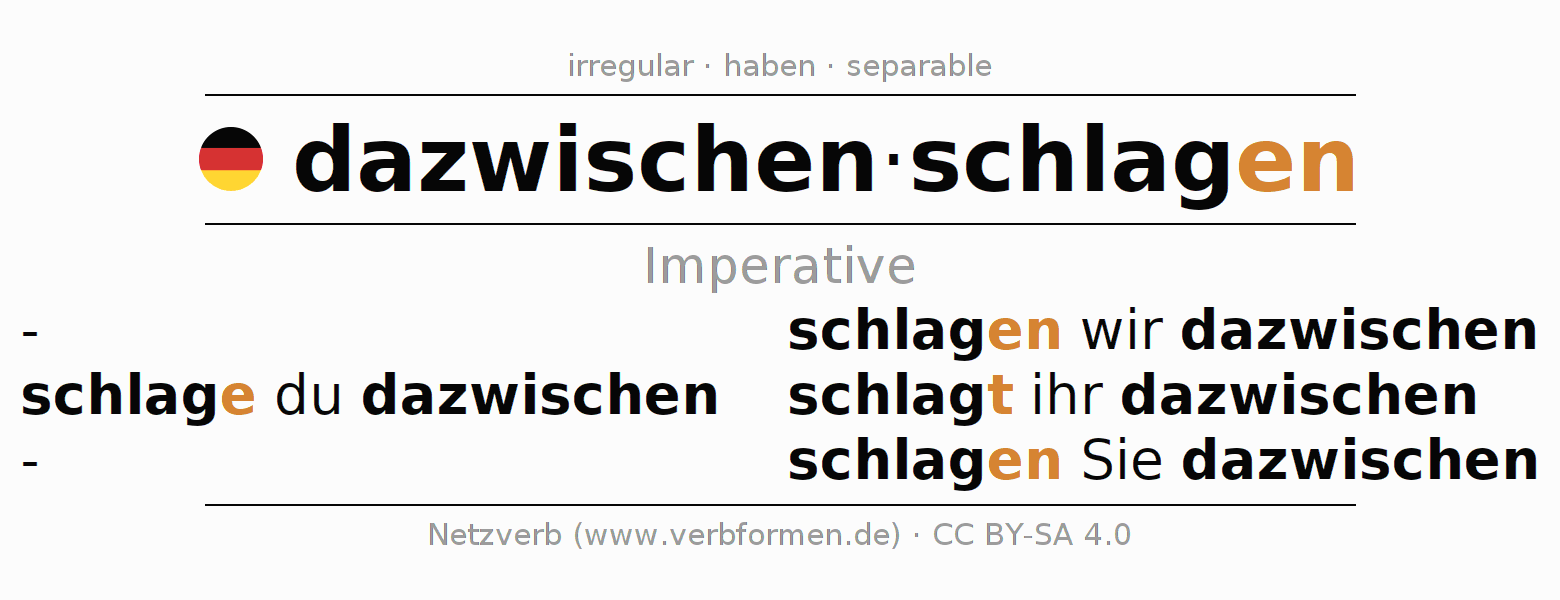 The conjugation of dazwischenschlagen (wade in, interject) in the imperative is: schlage (du) dazwischen, schlagen wir dazwischen, schlagt (ihr) dazwischen, schlagen Sie dazwischen. The imperative is formed with the stem of present tense schlag. The endings -e, -en, -t, -en are appended to the stem. The prefix dazwischen- of dazwischenschlagen is separated.The personal pronoun is usually omitted in the 2nd person singular.The formation of the forms corresponds to the grammatical rules for the conjugation of the verbs in imperative. Comments ☆