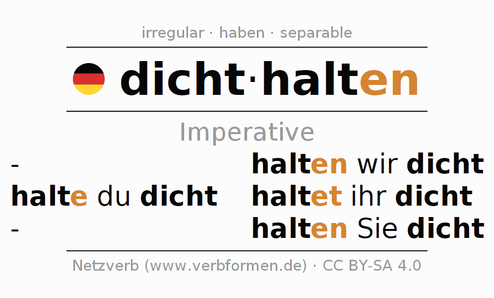 The conjugation of dichthalten (keep mum, hold one's tongue) in the imperative is: halte (du) dicht, halten wir dicht, haltet (ihr) dicht, halten Sie dicht. The imperative is formed with the stem of present tense halt. The endings -e, -en, -et, -en are appended to the stem. The ending of the 2nd Person Singular is extended by an e, as the stem ends in t. The prefix dicht- of dichthalten is separated.The personal pronoun is usually omitted in the 2nd person singular.The formation of the forms corresponds to the grammatical rules for the conjugation of the verbs in imperative. Comments ☆
