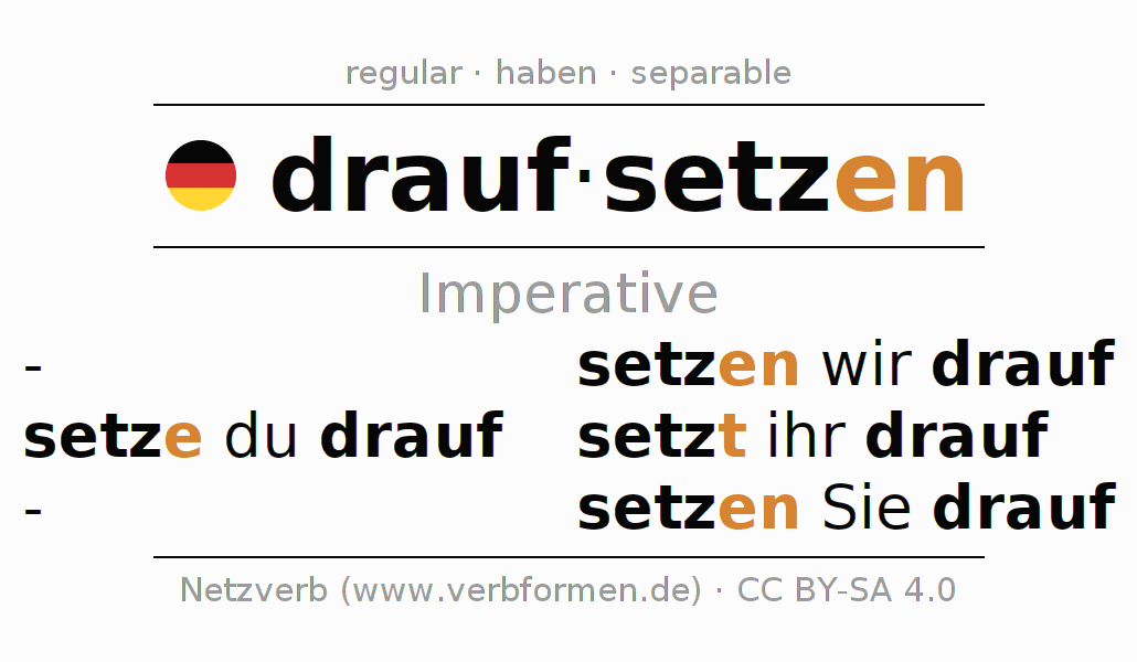 The conjugation of draufsetzen in the imperative is: setze (du) drauf, setzen wir drauf, setzt (ihr) drauf, setzen Sie drauf. The imperative is formed with the stem of present tense setz. The endings -e, -en, -t, -en are appended to the stem. The prefix drauf- of draufsetzen is separated.The personal pronoun is usually omitted in the 2nd person singular.The formation of the forms corresponds to the grammatical rules for the conjugation of the verbs in imperative. Comments ☆
