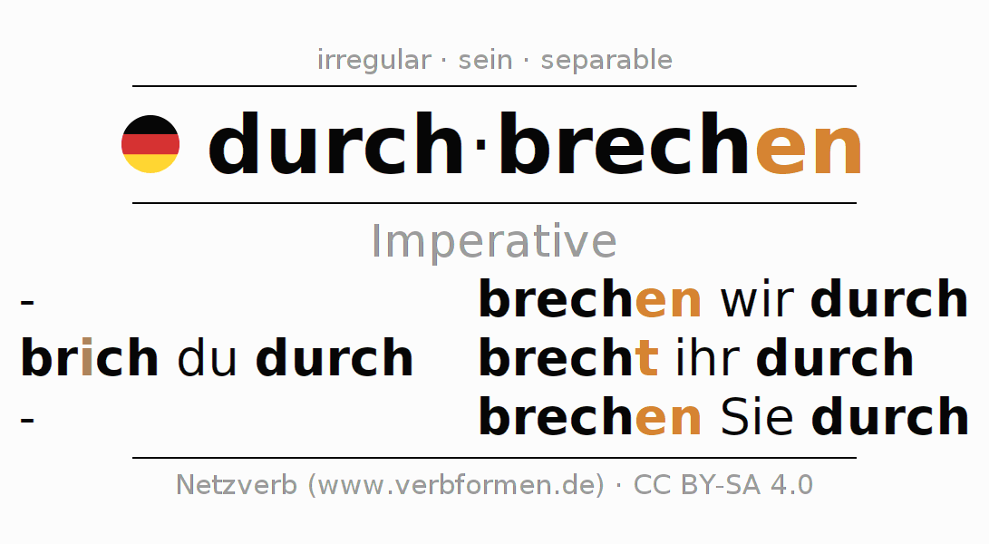 The verb durch-brechen (ist) fully conjugated in all persons and numbers in the Imperative Present