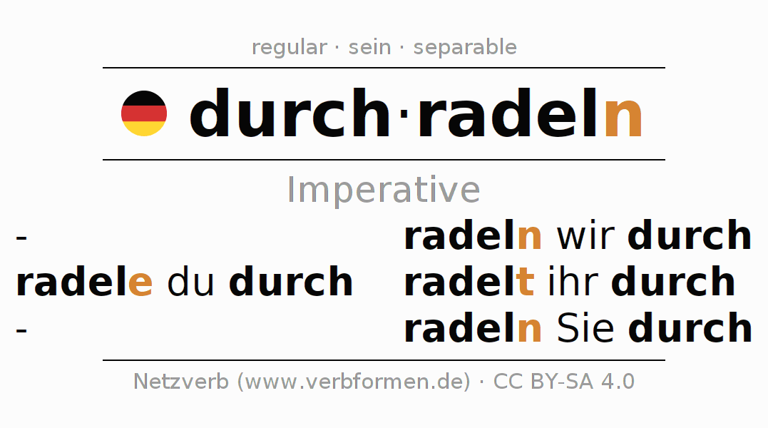 The conjugation of durchradeln (cycle through, bicycle through) in the imperative is: rad(e)le (du) durch, radeln wir durch, radelt (ihr) durch, radeln Sie durch. The imperative is formed with the stem of present tense radel. The endings -e, -n, -t, -n are appended to the stem. The endings in the 1st and 3rd person plural are shortened by e, since the verb ends with -ern. The prefix durch- of durchradeln is separated.The personal pronoun is usually omitted in the 2nd person singular.The formation of the forms corresponds to the grammatical rules for the conjugation of the verbs in imperative. Comments ☆