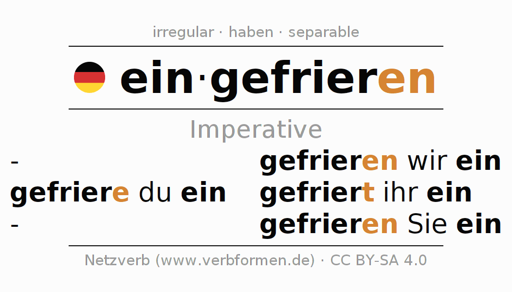 The conjugation of eingefrieren (freeze, solidify) in the imperative is: gefriere (du) ein, gefrieren wir ein, gefriert (ihr) ein, gefrieren Sie ein. The imperative is formed with the stem of present tense frier. The endings -e, -en, -t, -en are appended to the stem. The prefix ein- of eingefrieren is separated.The personal pronoun is usually omitted in the 2nd person singular.The formation of the forms corresponds to the grammatical rules for the conjugation of the verbs in imperative. Comments ☆