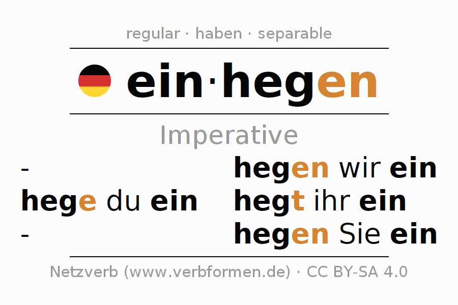 The conjugation of einhegen (enclose, fence in) in the imperative is: hege (du) ein, hegen wir ein, hegt (ihr) ein, hegen Sie ein. The imperative is formed with the stem of present tense heg. The endings -e, -en, -t, -en are appended to the stem. The prefix ein- of einhegen is separated.The personal pronoun is usually omitted in the 2nd person singular.The formation of the forms corresponds to the grammatical rules for the conjugation of the verbs in imperative. Comments ☆