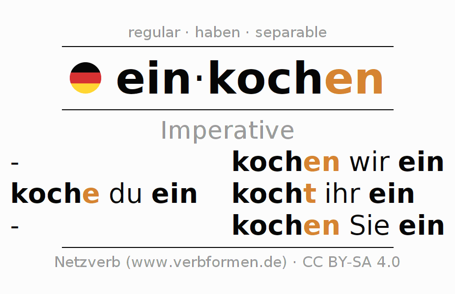 The conjugation of einkochen (boil down, concentrate) in the imperative is: koche (du) ein, kochen wir ein, kocht (ihr) ein, kochen Sie ein. The imperative is formed with the stem of present tense koch. The endings -e, -en, -t, -en are appended to the stem. The prefix ein- of einkochen is separated.The personal pronoun is usually omitted in the 2nd person singular.The formation of the forms corresponds to the grammatical rules for the conjugation of the verbs in imperative. Comments ☆
