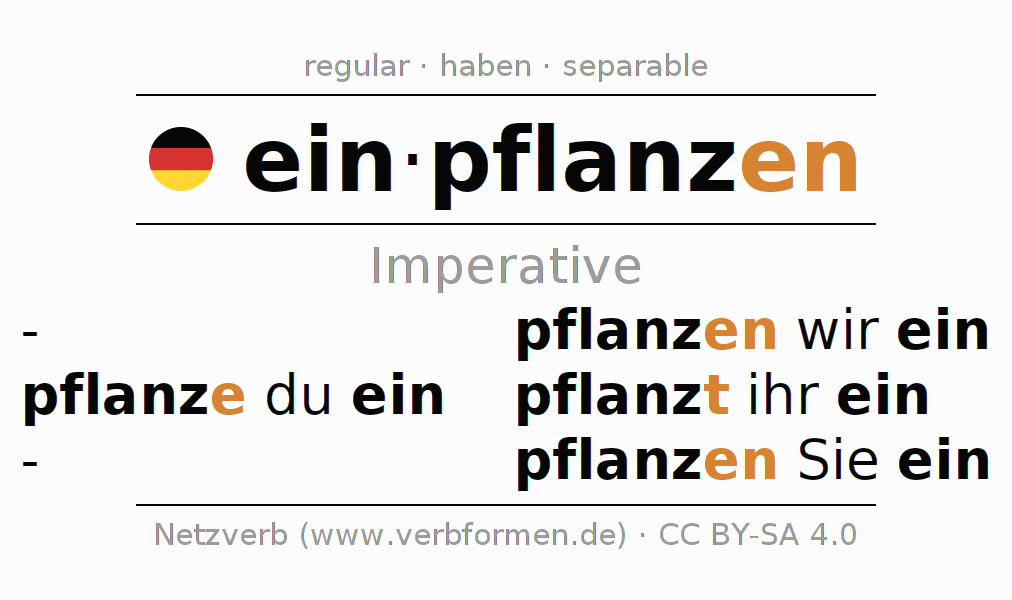 The conjugation of einpflanzen (plant, engraft) in the imperative is: pflanze (du) ein, pflanzen wir ein, pflanzt (ihr) ein, pflanzen Sie ein. The imperative is formed with the stem of present tense pflanz. The endings -e, -en, -t, -en are appended to the stem. The prefix ein- of einpflanzen is separated.The personal pronoun is usually omitted in the 2nd person singular.The formation of the forms corresponds to the grammatical rules for the conjugation of the verbs in imperative. Comments ☆