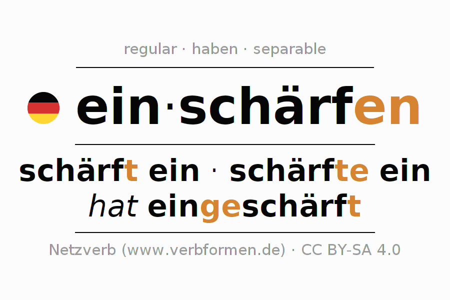 The conjugation of einschärfen (emphasize, inculcate) in the imperative is: schärfe (du) ein, schärfen wir ein, schärft (ihr) ein, schärfen Sie ein. The imperative is formed with the stem of present tense schärf. The endings -e, -en, -t, -en are appended to the stem. The prefix ein- of einschärfen is separated.The personal pronoun is usually omitted in the 2nd person singular.The formation of the forms corresponds to the grammatical rules for the conjugation of the verbs in imperative. Comments ☆