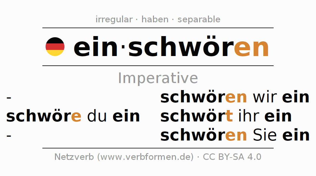 The conjugation of einschwören (swear in, bind to do) in the imperative is: schwöre (du) ein, schwören wir ein, schwört (ihr) ein, schwören Sie ein. The imperative is formed with the stem of present tense schwör. The endings -e, -en, -t, -en are appended to the stem. The prefix ein- of einschwören is separated.The personal pronoun is usually omitted in the 2nd person singular.The formation of the forms corresponds to the grammatical rules for the conjugation of the verbs in imperative. Comments ☆