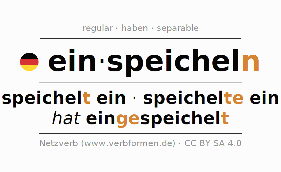 The conjugation of einspeicheln (insalivate, mix with saliva) in the imperative is: speich(e)le (du) ein, speicheln wir ein, speichelt (ihr) ein, speicheln Sie ein. The imperative is formed with the stem of present tense speichel. The endings -e, -n, -t, -n are appended to the stem. The endings in the 1st and 3rd person plural are shortened by e, since the verb ends with -ern. The prefix ein- of einspeicheln is separated.The personal pronoun is usually omitted in the 2nd person singular.The formation of the forms corresponds to the grammatical rules for the conjugation of the verbs in imperative. Comments ☆
