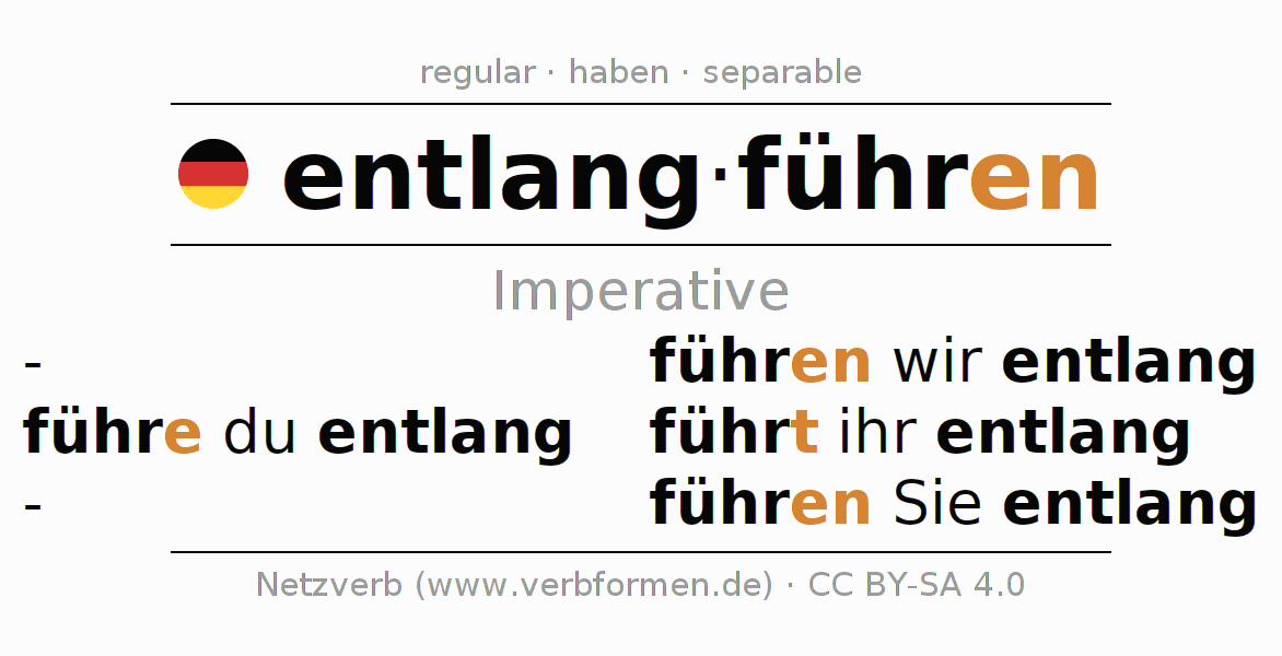 The conjugation of entlangführen (lead along, guide) in the imperative is: führe (du) entlang, führen wir entlang, führt (ihr) entlang, führen Sie entlang. The imperative is formed with the stem of present tense führ. The endings -e, -en, -t, -en are appended to the stem. The prefix entlang- of entlangführen is separated.The personal pronoun is usually omitted in the 2nd person singular.The formation of the forms corresponds to the grammatical rules for the conjugation of the verbs in imperative. Comments ☆