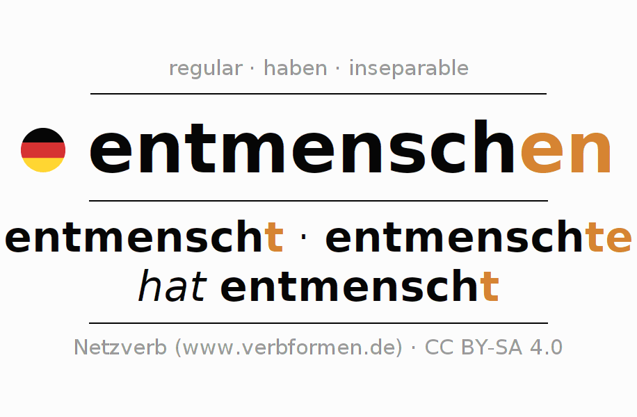 The conjugation of entmenschen (dehumanize, brutalize) in the imperative is: entmensche (du), entmenschen wir, entmenscht (ihr), entmenschen Sie. The imperative is formed with the stem of present tense mensch. The endings -e, -en, -t, -en are appended to the stem. The personal pronoun is usually omitted in the 2nd person singular.The formation of the forms corresponds to the grammatical rules for the conjugation of the verbs in imperative. Comments ☆