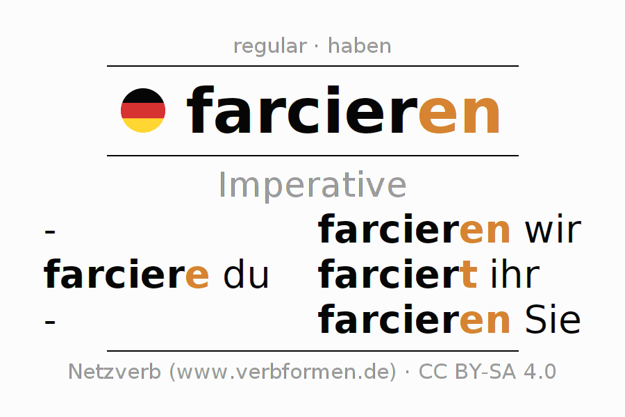 The conjugation of farcieren (fill, staff) in the imperative is: farciere (du), farcieren wir, farciert (ihr), farcieren Sie. The imperative is formed with the stem of present tense farcier. The endings -e, -en, -t, -en are appended to the stem. The personal pronoun is usually omitted in the 2nd person singular.The formation of the forms corresponds to the grammatical rules for the conjugation of the verbs in imperative. Comments ☆