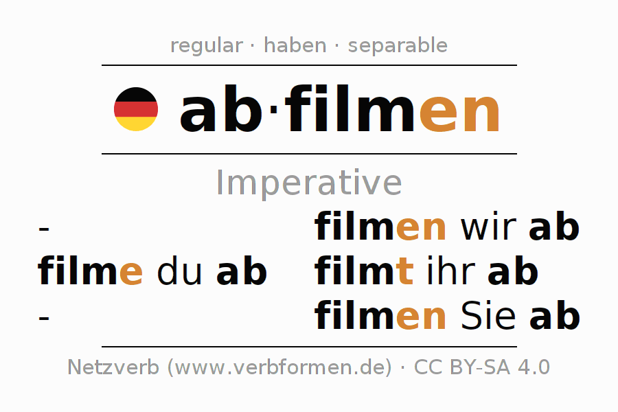 The conjugation of abfilmen in Imperative Present Imperative Active is filme (du) ab, filmen wir ab, filmt (ihr) ab, filmen Sie ab.The conjugation corresponds to certain grammatical rules. Likewise the requirements for the conjugation of the simple verb forms of abfilmen in Imperative. Comments ☆