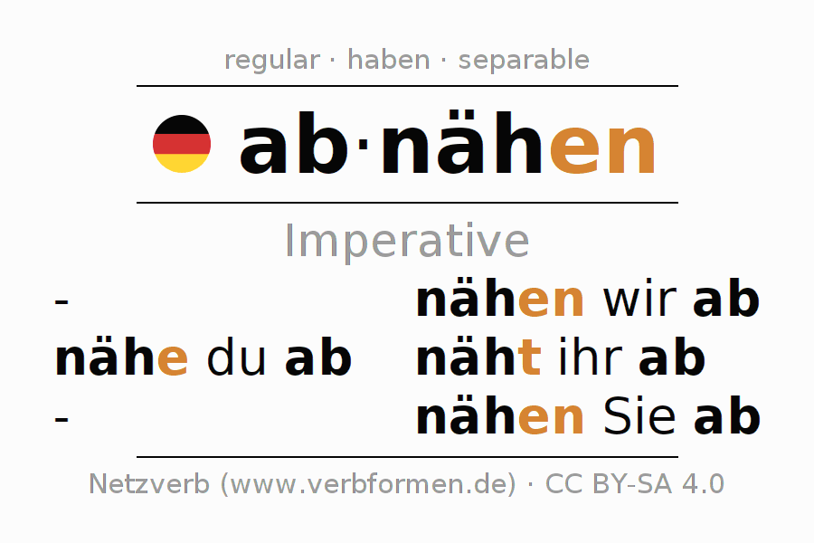 The verb abnähen fully conjugated in all persons and numbers in the Imperative Present