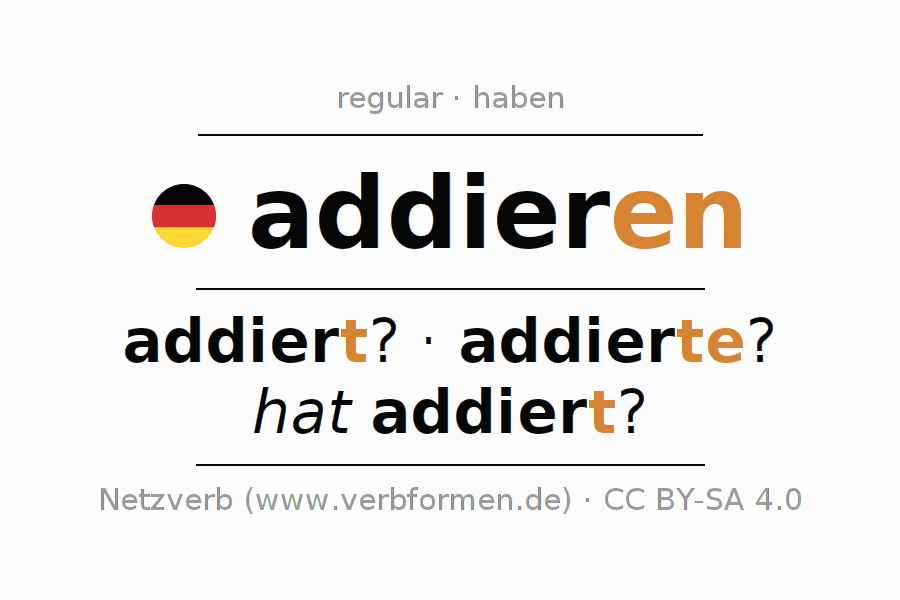 The conjugation of addieren in Imperative Present Imperative Active is addiere (du), addieren wir, addiert (ihr), addieren Sie.The conjugation corresponds to certain grammatical rules. Likewise the requirements for the conjugation of the simple verb forms of addieren in Imperative. Comments ☆