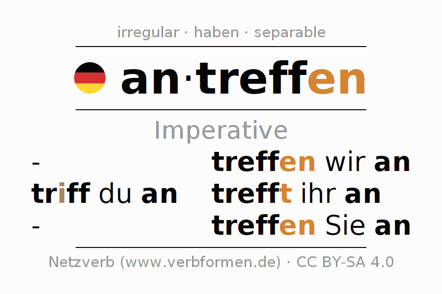 The verb antreffen fully conjugated in all persons and numbers in the Imperative Present