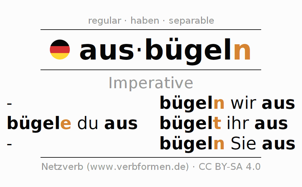 The verb ausbügeln fully conjugated in all persons and numbers in the Imperative Present