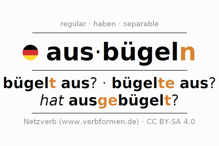 The conjugation of ausbügeln in Imperative Present Imperative Active is büg(e)le (du) aus, bügeln wir aus, bügelt (ihr) aus, bügeln Sie aus.The conjugation corresponds to certain grammatical rules. Likewise the requirements for the conjugation of the simple verb forms of ausbügeln in Imperative. Comments ☆
