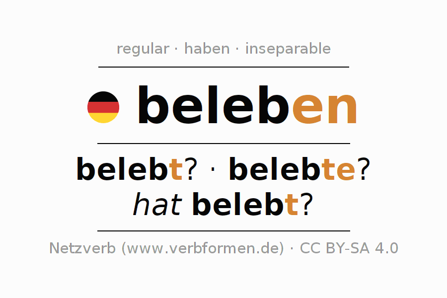 The conjugation of beleben in Imperative Present Imperative Active is belebe (du), beleben wir, belebt (ihr), beleben Sie.The conjugation corresponds to certain grammatical rules. Likewise the requirements for the conjugation of the simple verb forms of beleben in Imperative. Comments ☆