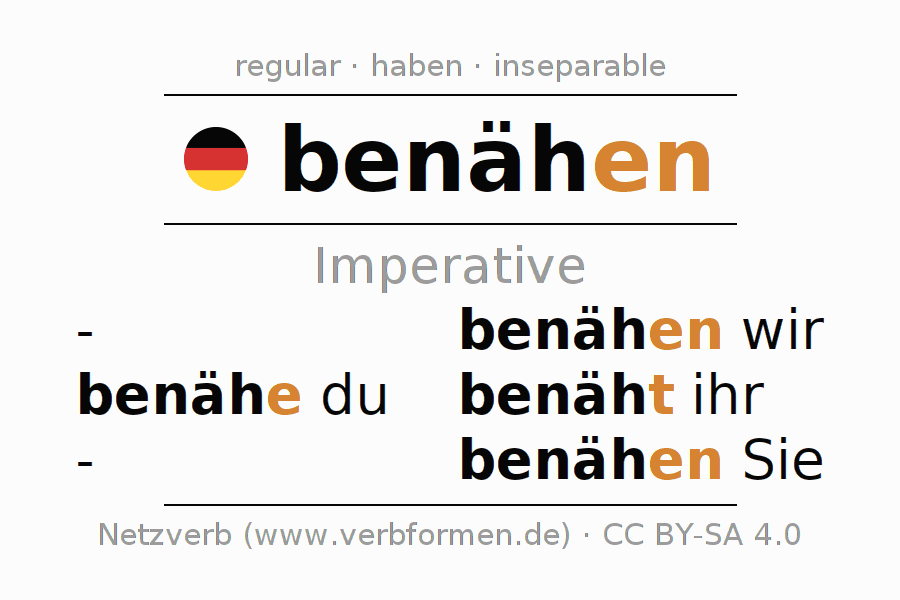 The verb benähen fully conjugated in all persons and numbers in the Imperative Present