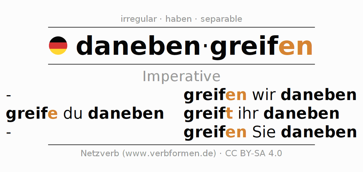 The verb danebengreifen fully conjugated in all persons and numbers in the Imperative Present