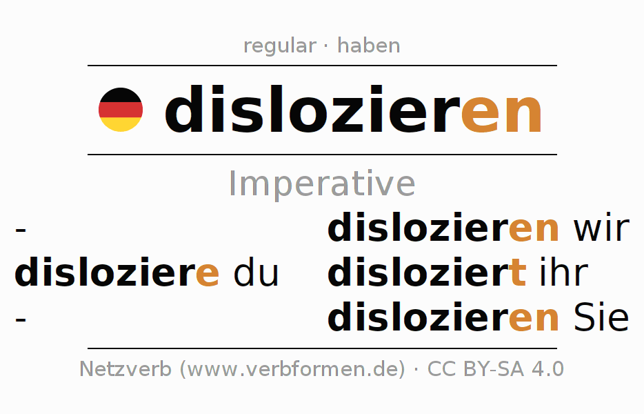 The conjugation of dislozieren in Imperative Present Imperative Active is disloziere (du), dislozieren wir, disloziert (ihr), dislozieren Sie.The conjugation corresponds to certain grammatical rules. Likewise the requirements for the conjugation of the simple verb forms of dislozieren in Imperative. Comments ☆