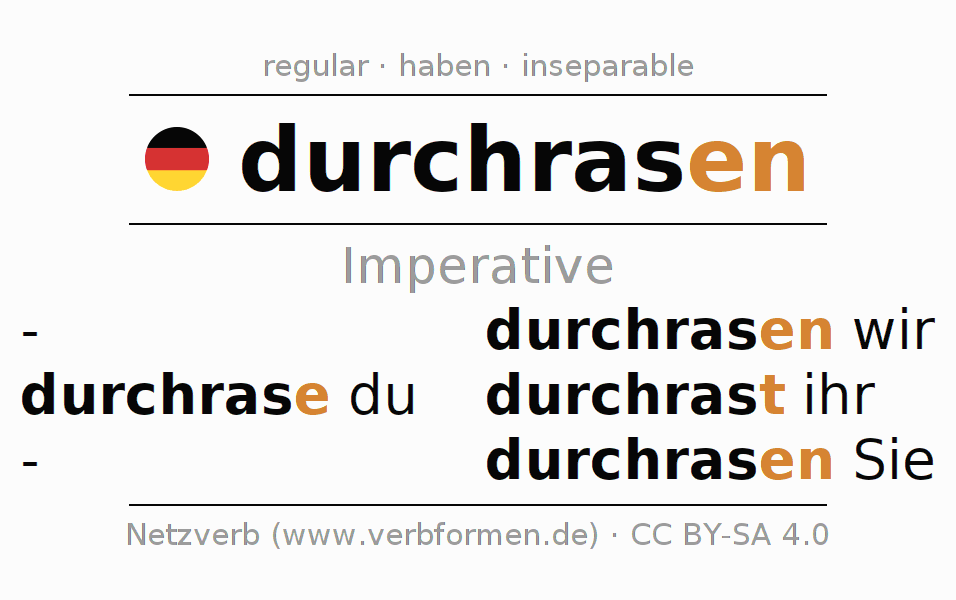The conjugation of durchrasen in Imperative Present Imperative Active is durchrase (du), durchrasen wir, durchrast (ihr), durchrasen Sie.The conjugation corresponds to certain grammatical rules. Likewise the requirements for the conjugation of the simple verb forms of durchrasen in Imperative. Comments ☆