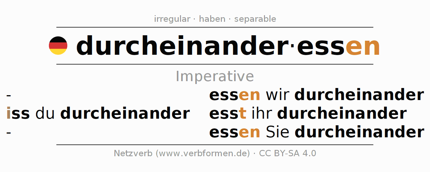 The verb durcheinanderessen fully conjugated in all persons and numbers in the Imperative Present