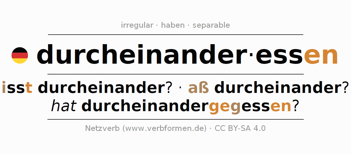 The conjugation of durcheinanderessen in Imperative Present Imperative Active is iss (du) durcheinander, essen wir durcheinander, esst (ihr) durcheinander, essen Sie durcheinander.The conjugation corresponds to certain grammatical rules. Likewise the requirements for the conjugation of the simple verb forms of durcheinanderessen in Imperative. Comments ☆