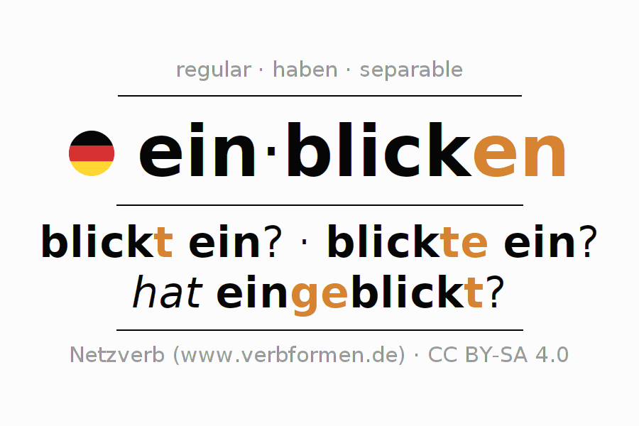 The conjugation of einblicken in Imperative Present Imperative Active is blicke (du) ein, blicken wir ein, blickt (ihr) ein, blicken Sie ein.The conjugation corresponds to certain grammatical rules. Likewise the requirements for the conjugation of the simple verb forms of einblicken in Imperative. Comments ☆