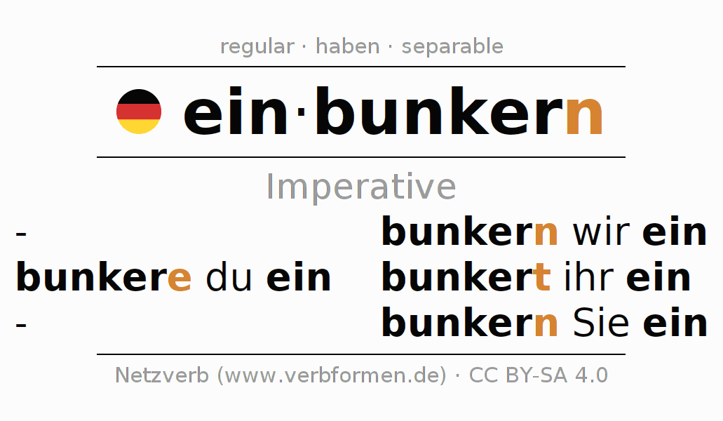 The conjugation of einbunkern in Imperative Present Imperative Active is bunk(e)re (du) ein, bunkern wir ein, bunkert (ihr) ein, bunkern Sie ein.The conjugation corresponds to certain grammatical rules. Likewise the requirements for the conjugation of the simple verb forms of einbunkern in Imperative. Comments ☆