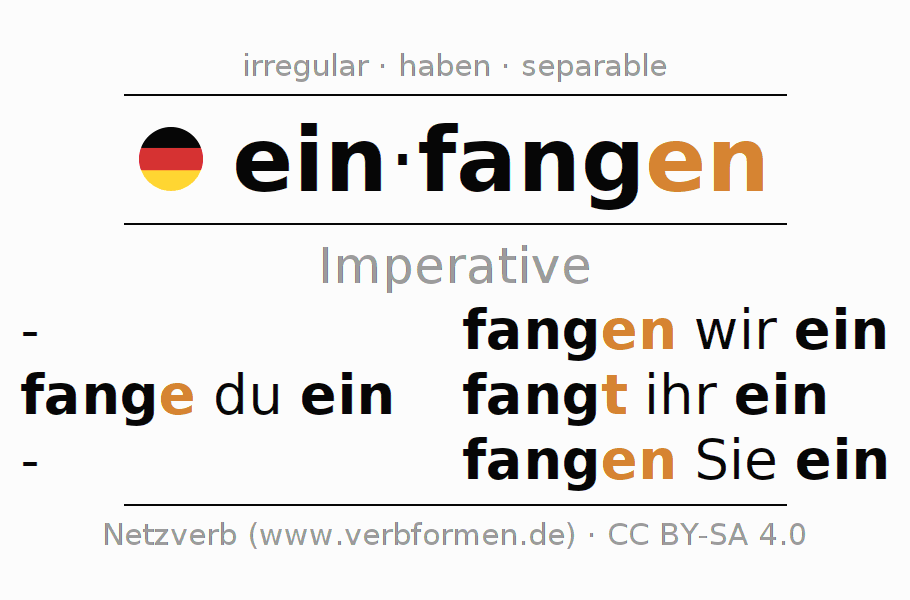The conjugation of einfangen in Imperative Present Imperative Active is fange (du) ein, fangen wir ein, fangt (ihr) ein, fangen Sie ein.The conjugation corresponds to certain grammatical rules. Likewise the requirements for the conjugation of the simple verb forms of einfangen in Imperative. Comments ☆