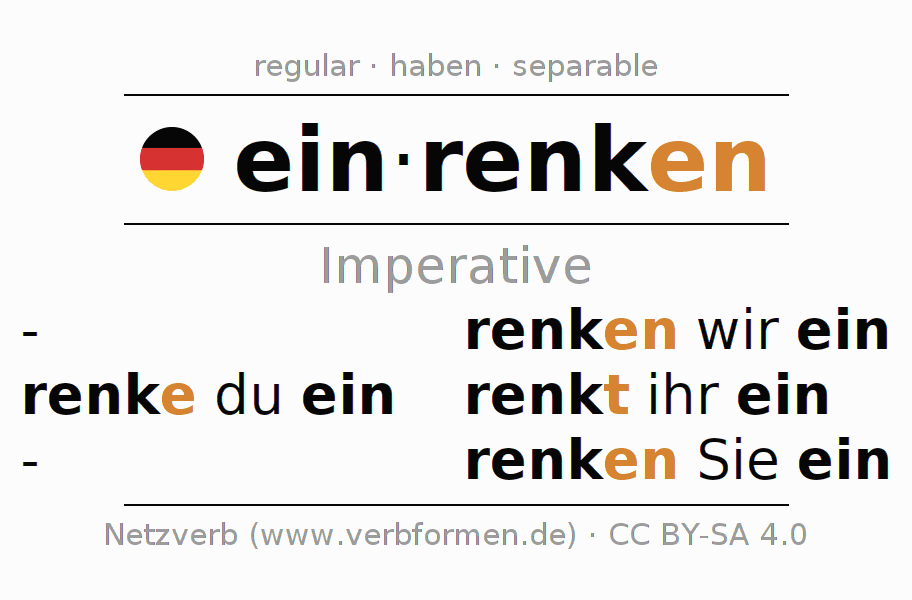 The conjugation of einrenken in Imperative Present Imperative Active is renke (du) ein, renken wir ein, renkt (ihr) ein, renken Sie ein.The conjugation corresponds to certain grammatical rules. Likewise the requirements for the conjugation of the simple verb forms of einrenken in Imperative. Comments ☆