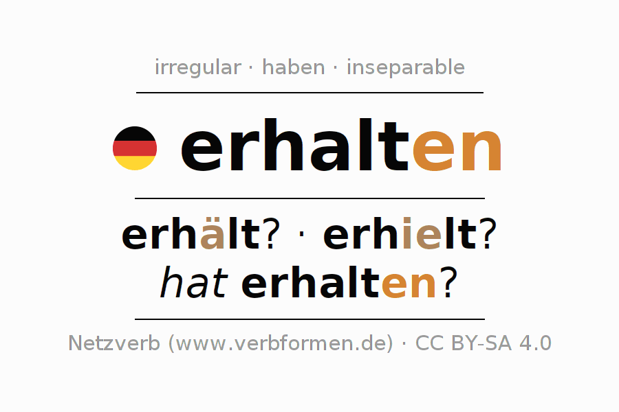 The conjugation of erhalten in Imperative Present Imperative Active is erhalte (du), erhalten wir, erhaltet (ihr), erhalten Sie.The conjugation corresponds to certain grammatical rules. Likewise the requirements for the conjugation of the simple verb forms of erhalten in Imperative. Comments ☆