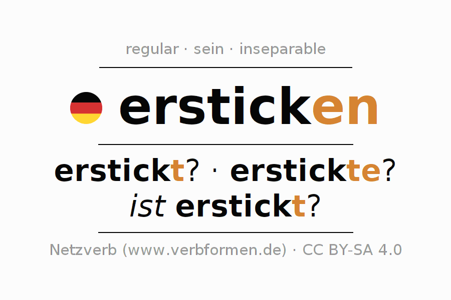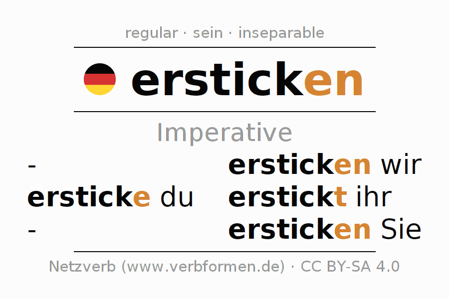 The conjugation of ersticken in Imperative Present Imperative Active is ersticke (du), ersticken wir, erstickt (ihr), ersticken Sie.The conjugation corresponds to certain grammatical rules. Likewise the requirements for the conjugation of the simple verb forms of ersticken in Imperative. Comments ☆
