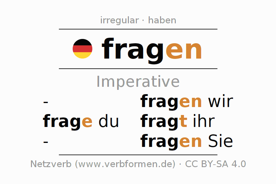 The conjugation of fragen in Imperative Present Imperative Active is frage (du), fragen wir, fragt (ihr), fragen Sie.The conjugation corresponds to certain grammatical rules. Likewise the requirements for the conjugation of the simple verb forms of fragen in Imperative. Comments ☆