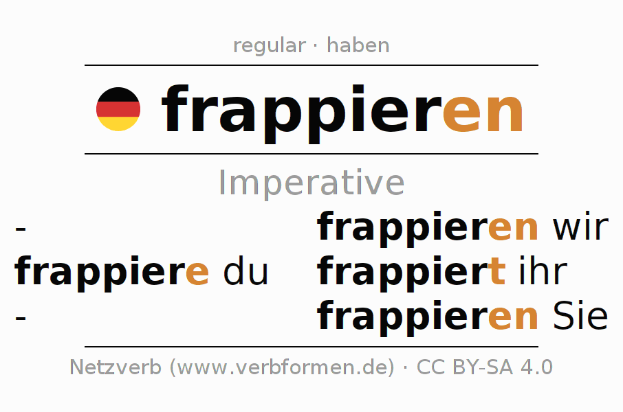 The conjugation of frappieren in Imperative Present Imperative Active is frappiere (du), frappieren wir, frappiert (ihr), frappieren Sie.The conjugation corresponds to certain grammatical rules. Likewise the requirements for the conjugation of the simple verb forms of frappieren in Imperative. Comments ☆