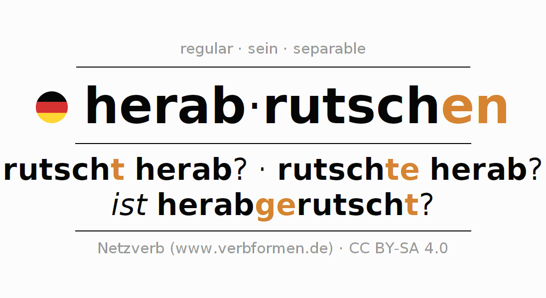 The conjugation of herabrutschen in Imperative Present Imperative Active is rutsche (du) herab, rutschen wir herab, rutscht (ihr) herab, rutschen Sie herab.The conjugation corresponds to certain grammatical rules. Likewise the requirements for the conjugation of the simple verb forms of herabrutschen in Imperative. Comments ☆