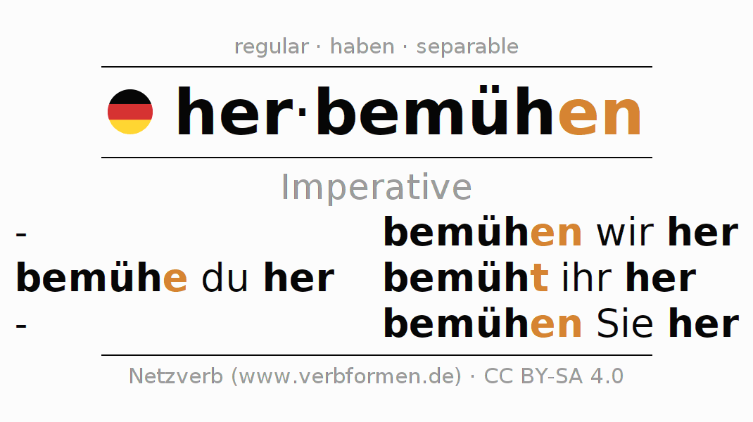 The conjugation of herbemühen in Imperative Present Imperative Active is bemühe (du) her, bemühen wir her, bemüht (ihr) her, bemühen Sie her.The conjugation corresponds to certain grammatical rules. Likewise the requirements for the conjugation of the simple verb forms of herbemühen in Imperative. Comments ☆