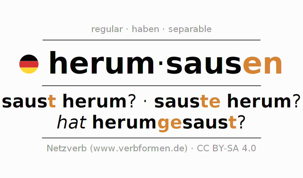 The conjugation of herumsausen in Imperative Present Imperative Active is sause (du) herum, sausen wir herum, saust (ihr) herum, sausen Sie herum.The conjugation corresponds to certain grammatical rules. Likewise the requirements for the conjugation of the simple verb forms of herumsausen in Imperative. Comments ☆