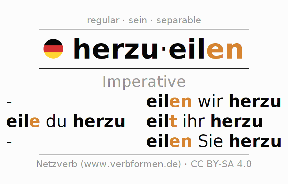 The conjugation of herzueilen in Imperative Present Imperative Active is eile (du) herzu, eilen wir herzu, eilt (ihr) herzu, eilen Sie herzu.The conjugation corresponds to certain grammatical rules. Likewise the requirements for the conjugation of the simple verb forms of herzueilen in Imperative. Comments ☆