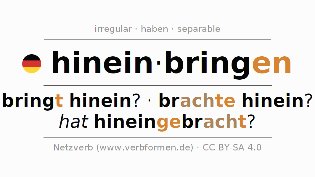 The conjugation of hineinbringen in Imperative Present Imperative Active is bringe (du) hinein, bringen wir hinein, bringt (ihr) hinein, bringen Sie hinein.The conjugation corresponds to certain grammatical rules. Likewise the requirements for the conjugation of the simple verb forms of hineinbringen in Imperative. Comments ☆