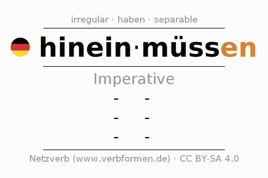 The verb hineinmüssen fully conjugated in all persons and numbers in the Imperative Present